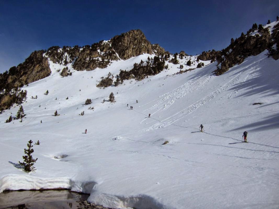 Nos espera ahora cruzar los ibones de Pondiellos para bajar (unos 350 mts) por una pala inclinada de nieve dura hasta el desagüe del ibón de Tebarray. Nos queda un último foqueo de casi 400 mts, así que ponemos de nuevo pieles para subir en busca del ibón, pero que iremos dejando a nuestra derecha siendo nuestra orientación norte, yendo directos en busca de esa cumbre con forma piramidal llamada Tebarray. Aunque la cumbre no llega por cien metros a ser un tresmil, las vistas a nuestro alrededor son de primerísimo orden (Balaitús, Garmo Negro, Piedrafita, Palas, Infiernos...) y allá abajo, ¡1.600 abajo!, nos espera Sallent de Gállego, nuestro destino final. Bajada que esquiaremos disfrutando a tope. Primero, la pala sur del Tebarray y su barranco, girando para coger el barranco de Pondiellos. Ya en la zona boscosa, trataremos de cruzar a la margen izquierda del barranco ya hasta ¡el mismo pueblo!. Lástima que sus calles las limpien de nieve...